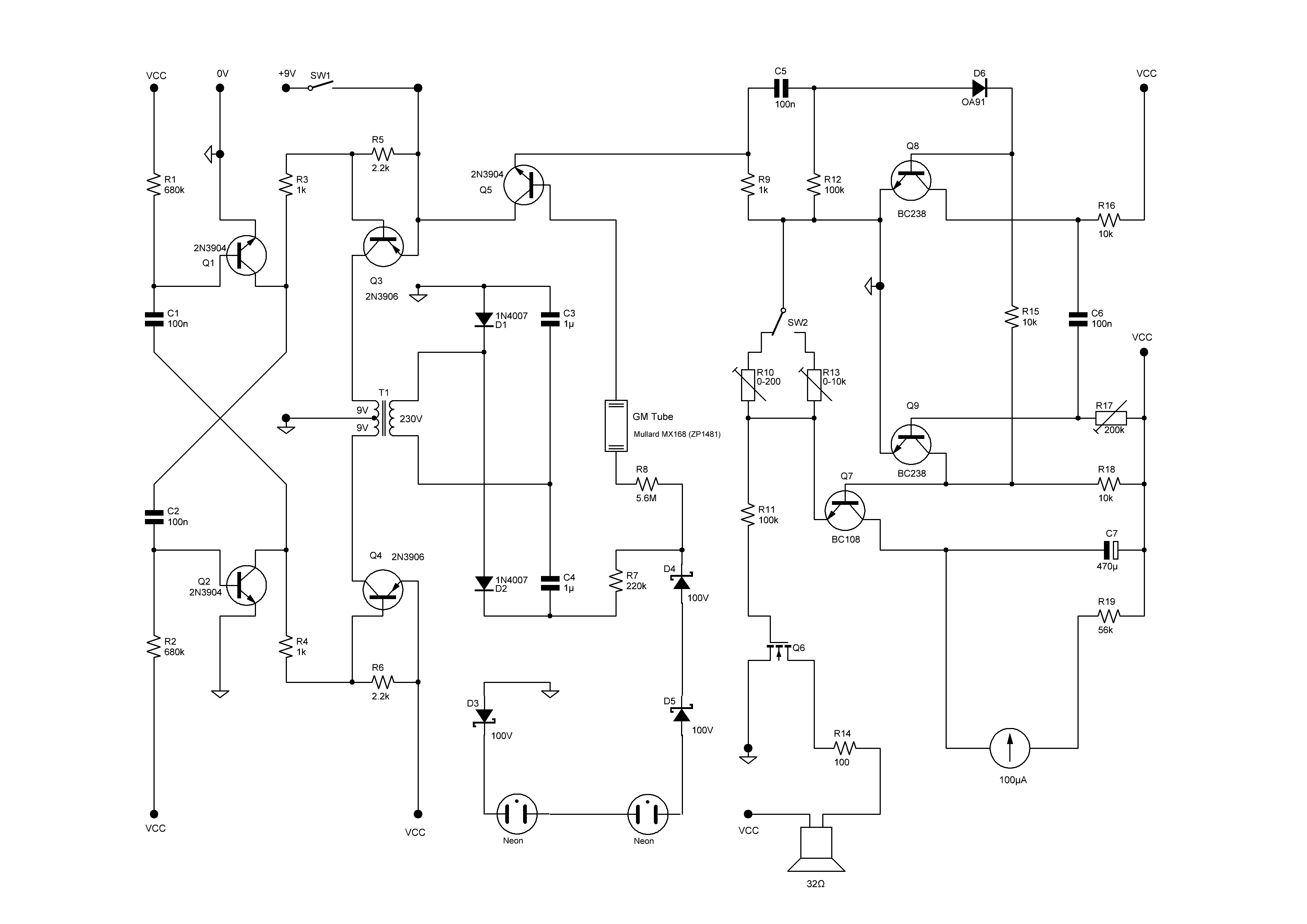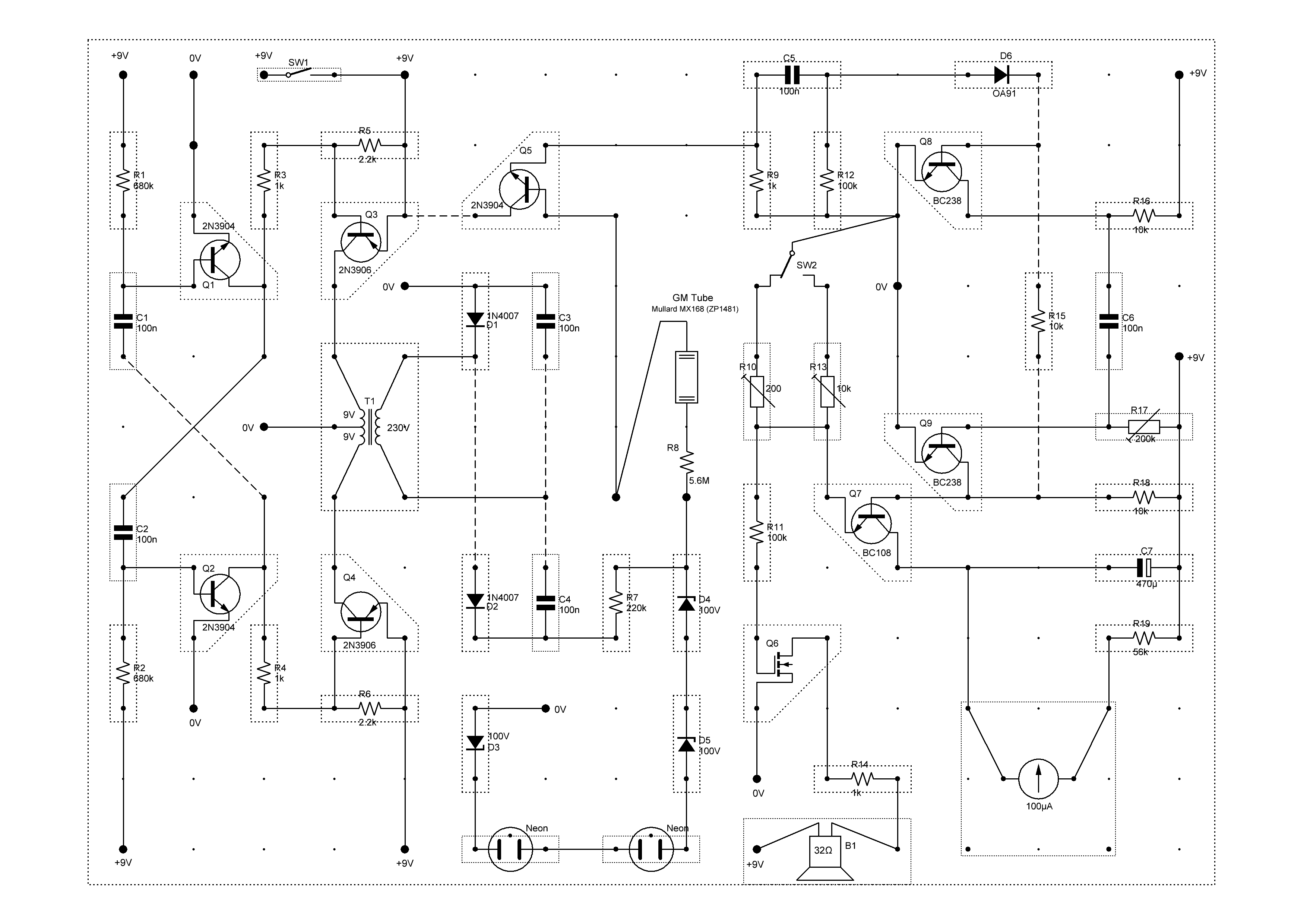 The regulated 400 volt DC output is fed to the Geiger-Muller tube. When radiation causes ionisation in the Geiger-Muller tube,