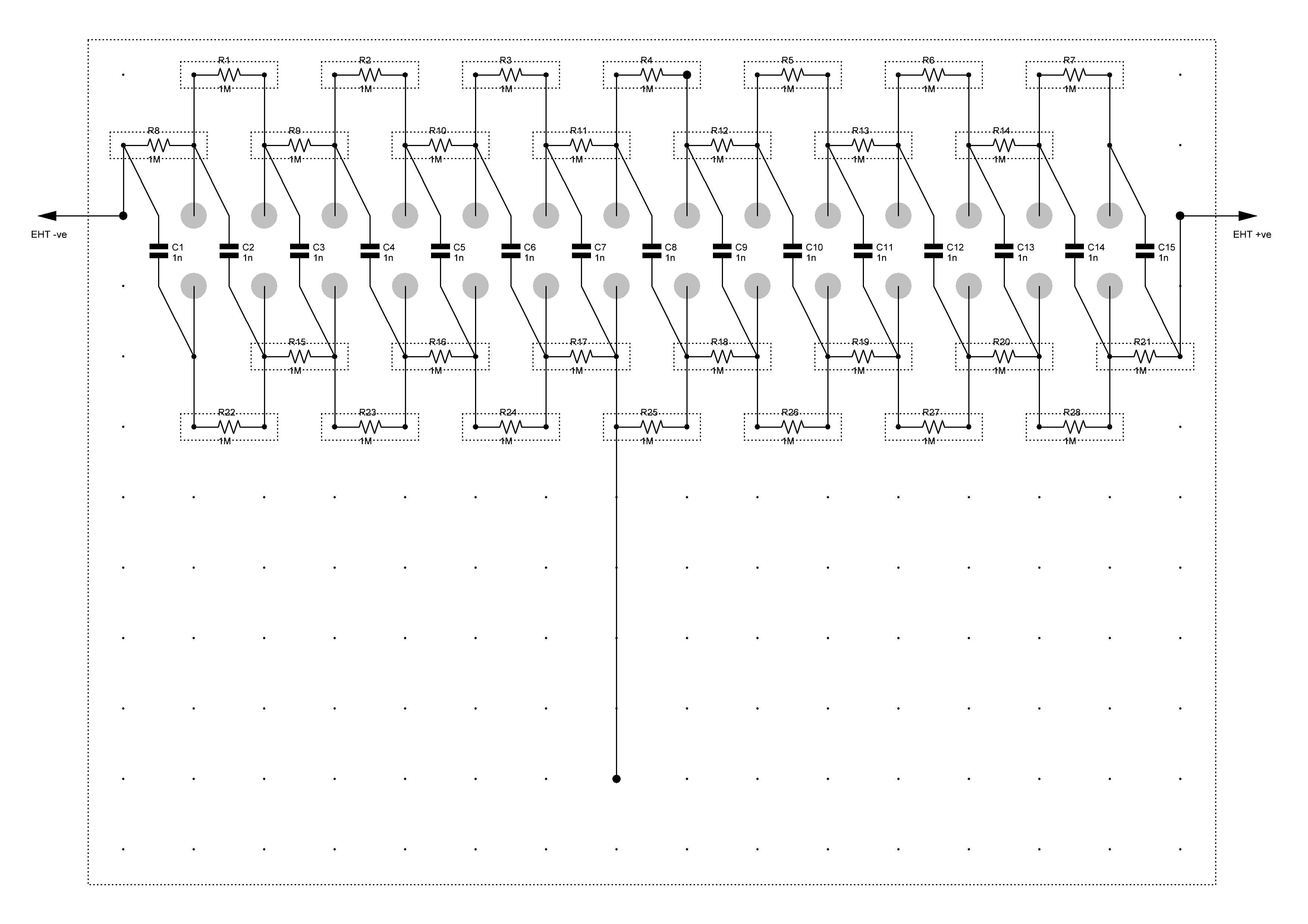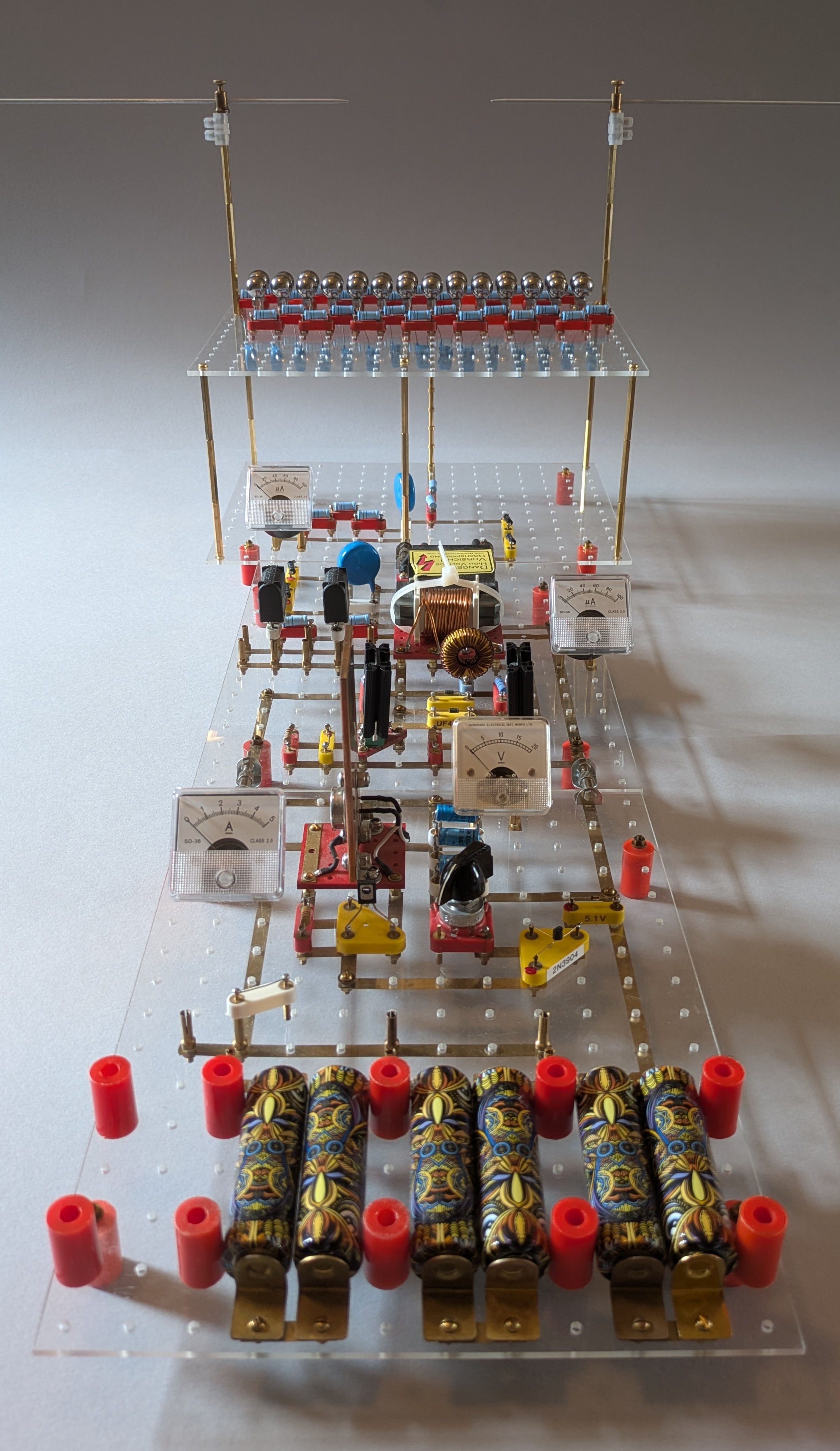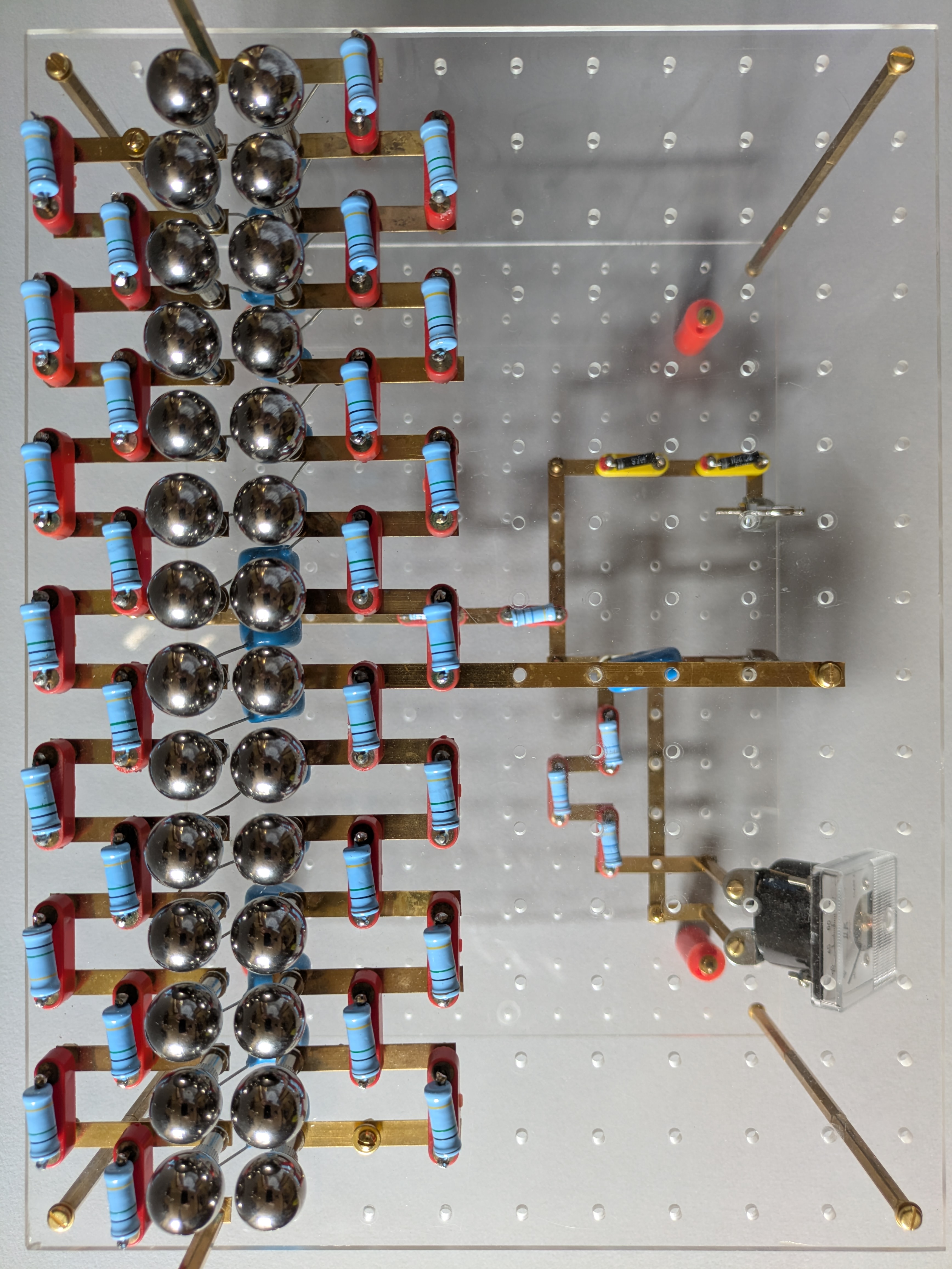 This is a 15 stage Marx generator using 1nF capacitors, 1M resistors and pairs of ball bearings to form the spark gaps.