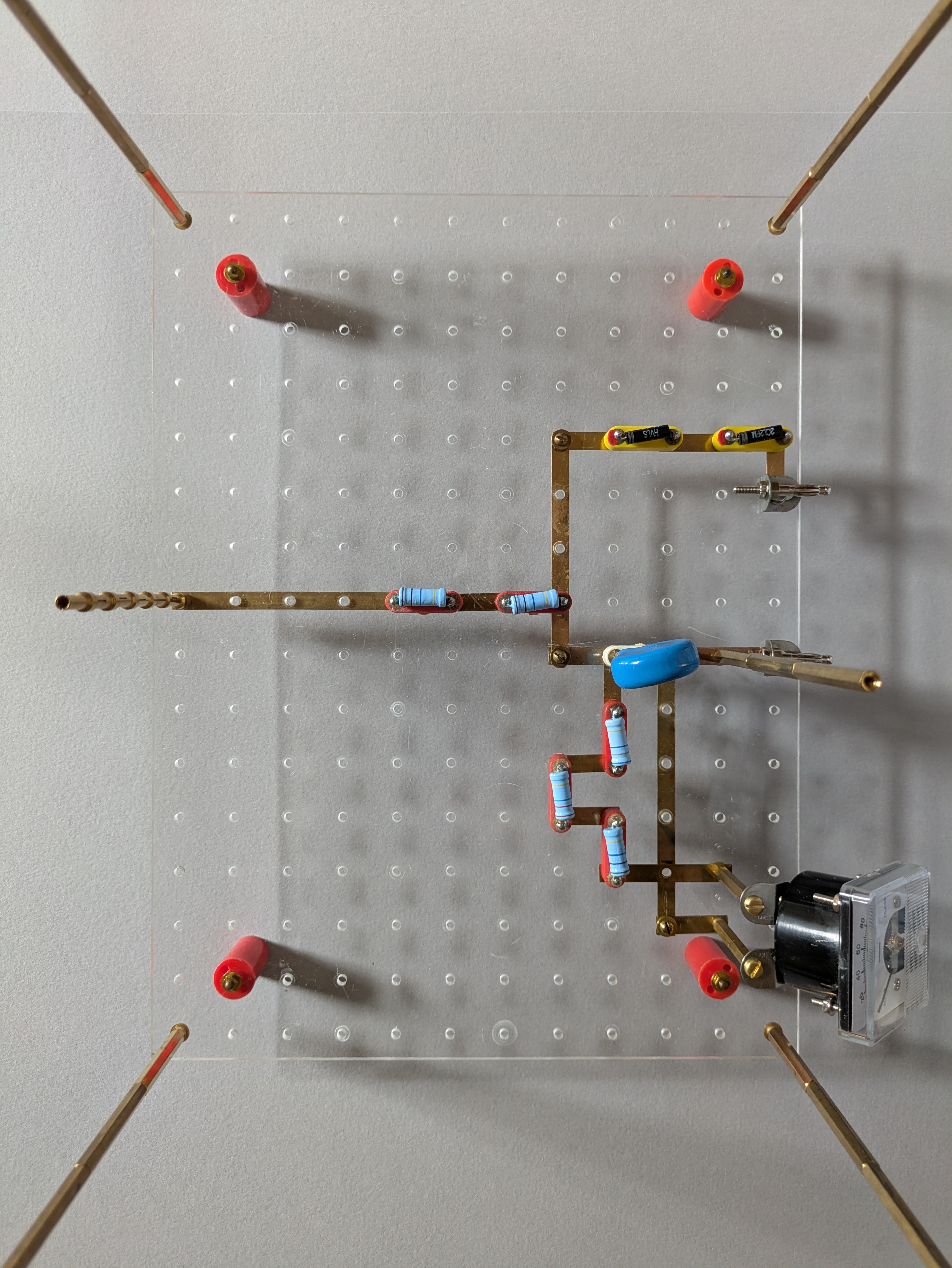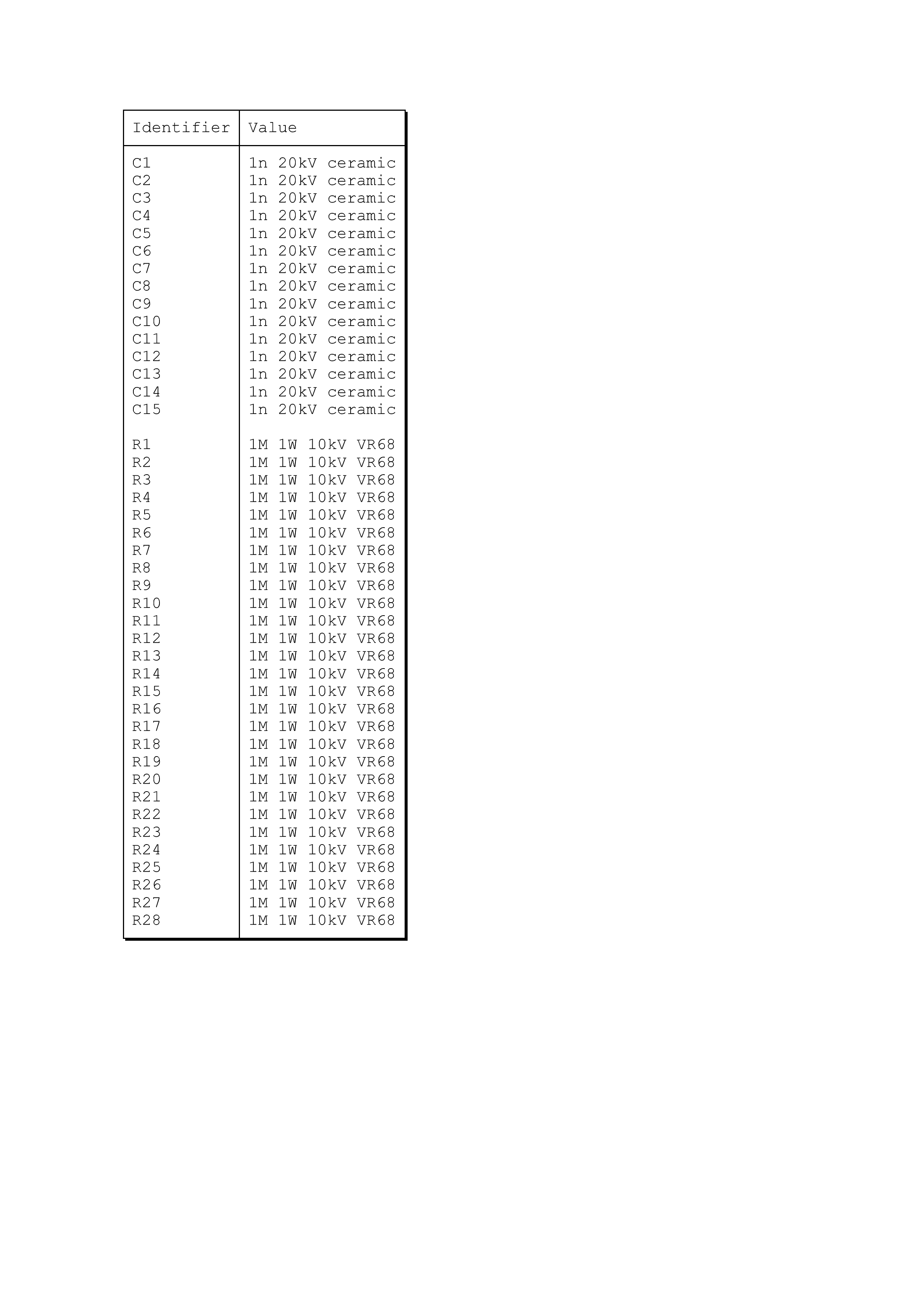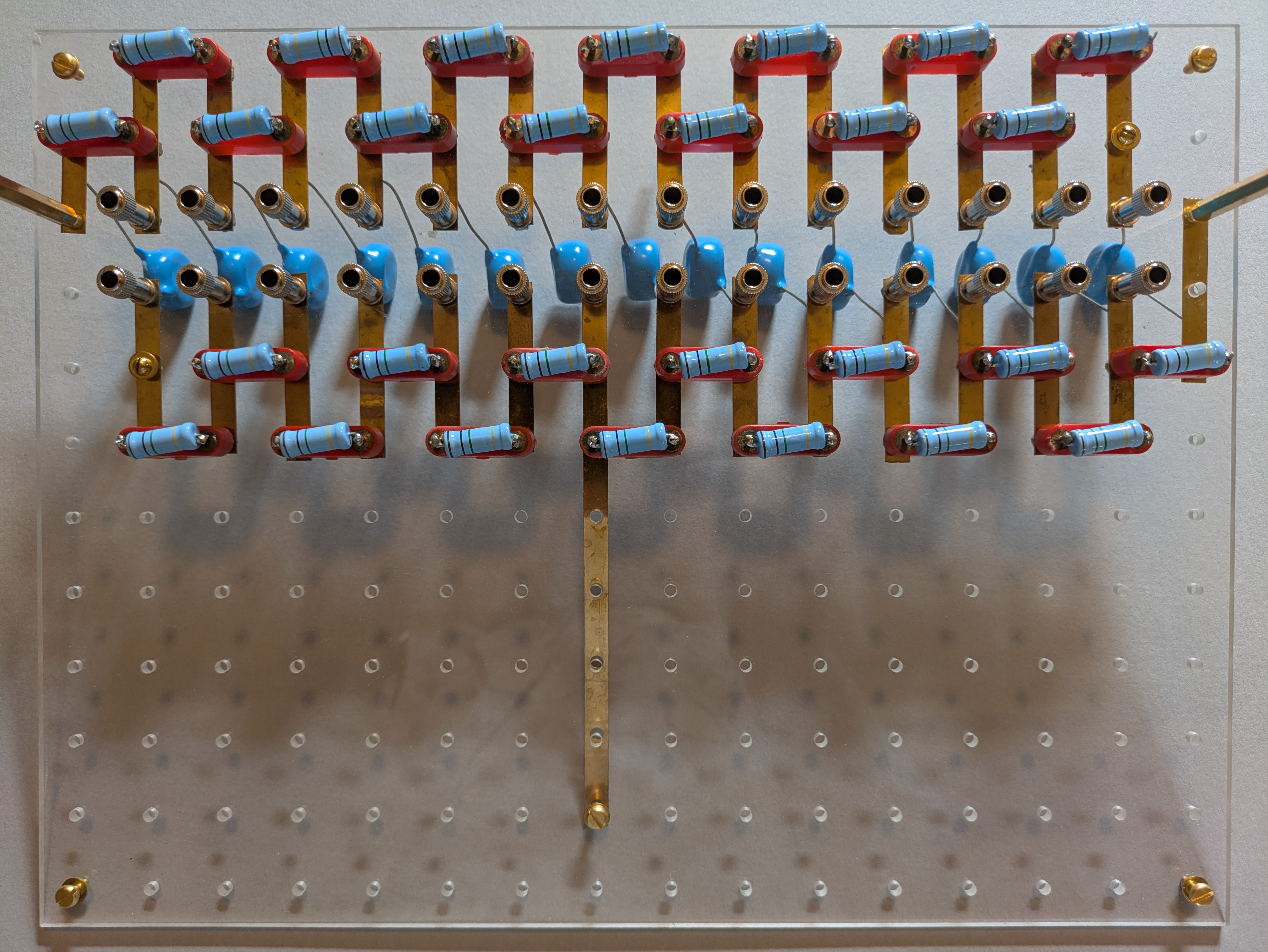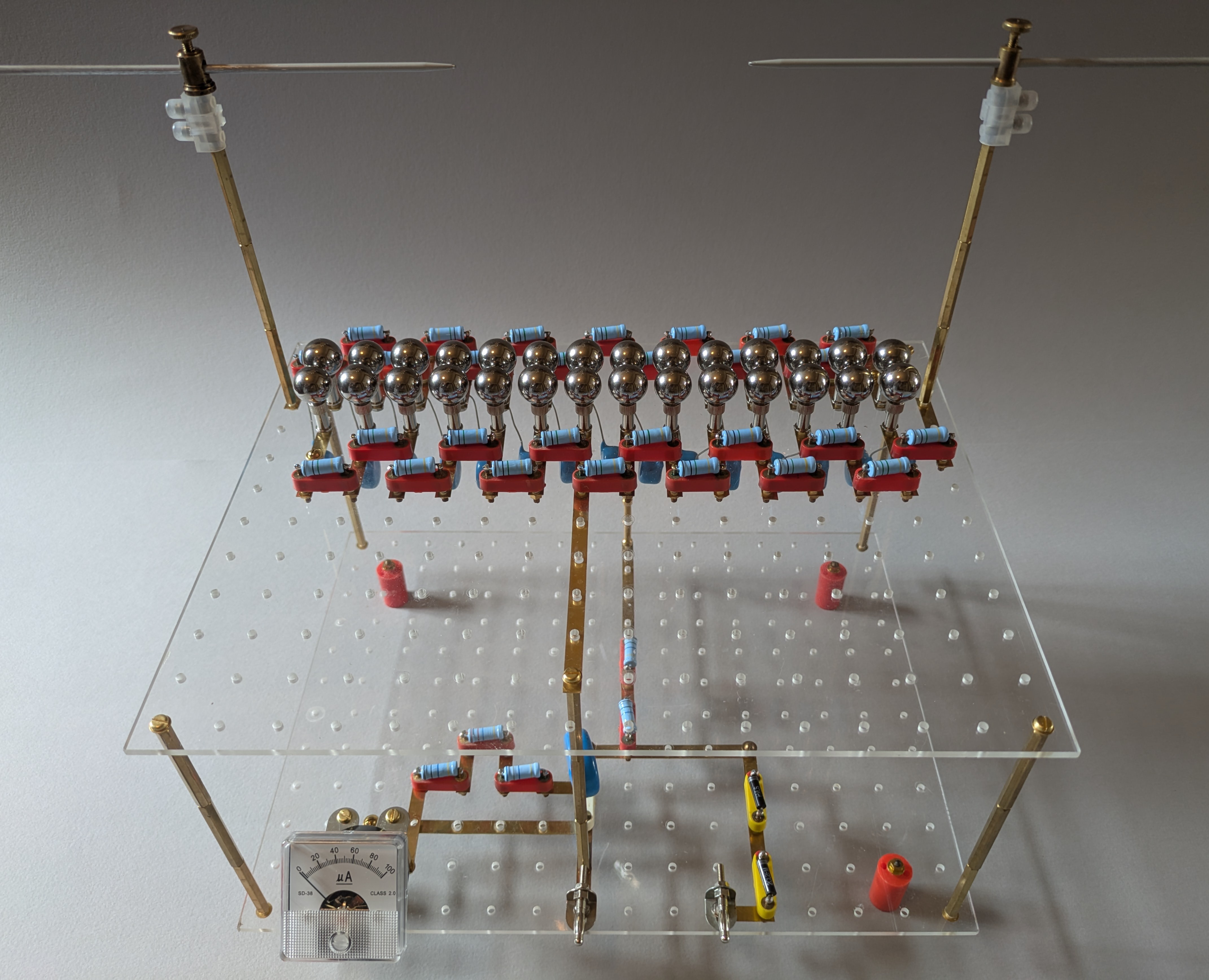 This is a 15 stage Marx generator using 1nF capacitors, 1M resistors and pairs of ball bearings to form the spark gaps.