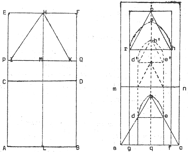 On the base AB the architect constructed a square ABCD, above that a second, CDEF; within the latter an equilateral triangle IKJ, whose base IK gives the opening of the dome. (see above). The polygon APIHKQB yields the schema of the interior. The line CD gives the lower border of the ledge, whose thickness is defined by the field CDIK. The interior is octagonal; one side of the octagon serves to determine the dimensions of the side-chambers and galleries. One side ac served as base for an equilateral triangle abc, whose vertex b yields the height of the ground floor pointed arch and whose side de of the inscribed square yields the width of the arch. The side ac of the octagon, when raised to a square by mn, gives the base of the upper galleries, the height of whose arches corresponds to twice the height of the triangle deb. The great arch rhs was constructed parallel to the arch d′b′e′ and its vertex s is as high as twice the length of the octagon side ac. Before restoration of the building, the height pq was equivalent to twice the length gf, i.e. the inner measurement between pillars, plus the height of the equilateral triangle rhp when placed on top of it.