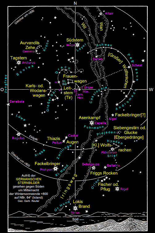 Aufriß der Germanischen Sternbilder gesehen gegen Süden um Mitternacht der Wintersonnwende +800 auf NBr. 64° (Island).