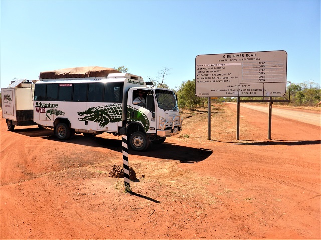 Comfortable bus, rumbling corrugated road - blue sky over scrub.Kimberley, Australia, August 2017